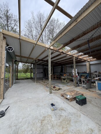 Before - Old open bay 3 Bay Goldpine Pole Shed After - Enclosed with 2 x roller doors, new paper & netting, and concrete floor.