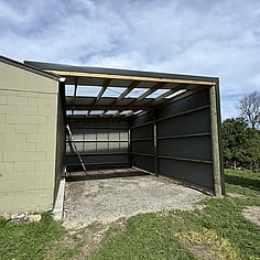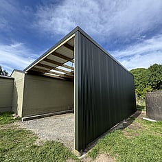 We typically use treated timber poles, structural framing, and Zincalume or Coloursteel roofing and cladding, designed for New Zealand conditions.